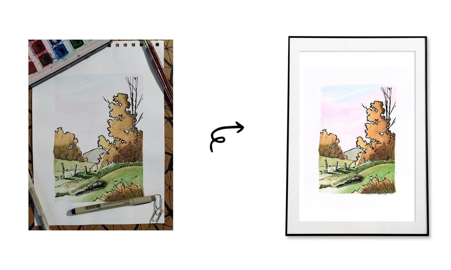 The painting depicts trees, with pen work capturing its branches, leaves, and bark. Watercolours are used to convey the natural colours and the vibrancy of the tree, symbolizing life and vitality.