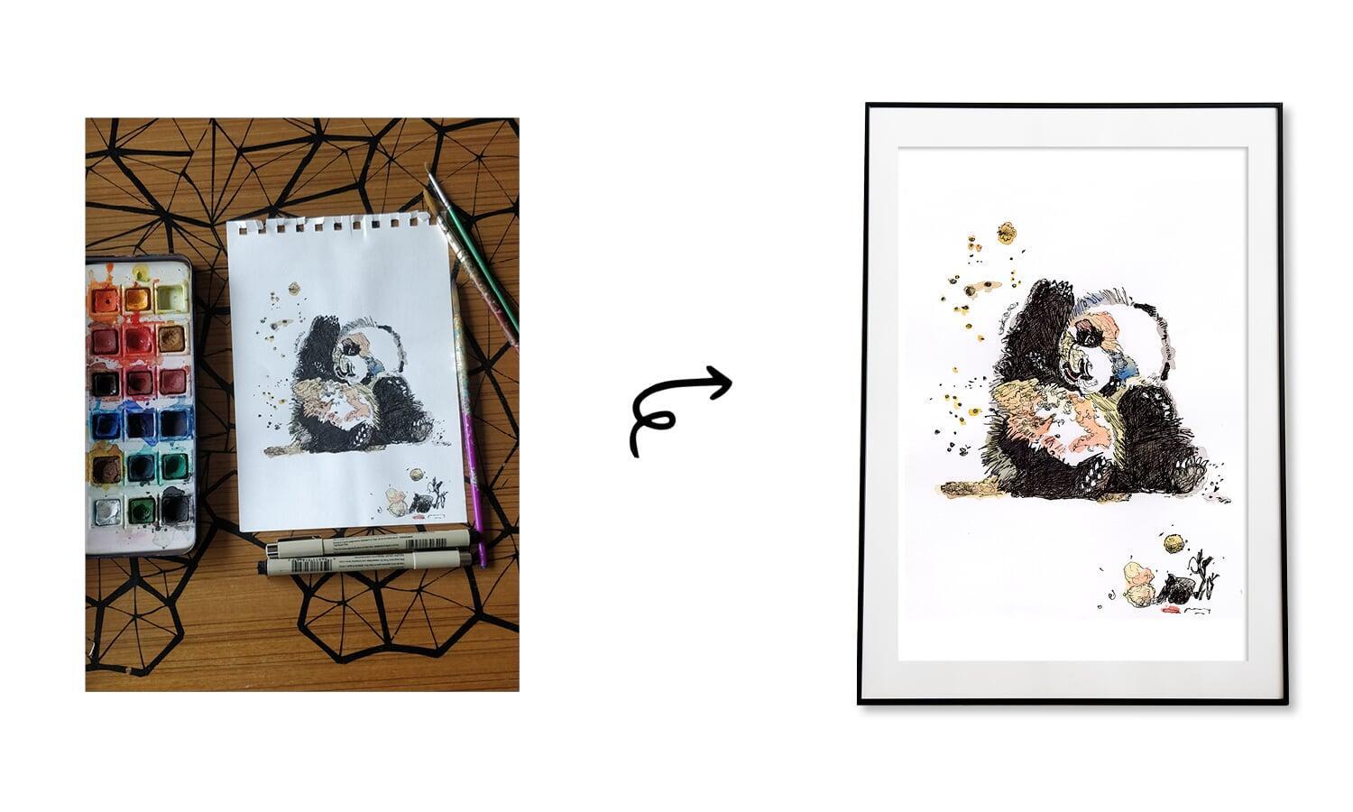 The painting depicts a charming panda, intricately detailed with pen work to capture the panda's playful and gentle features. Watercolours are used to evoke a soft and soothing colour palette, creating a sense of tranquility and contentment.