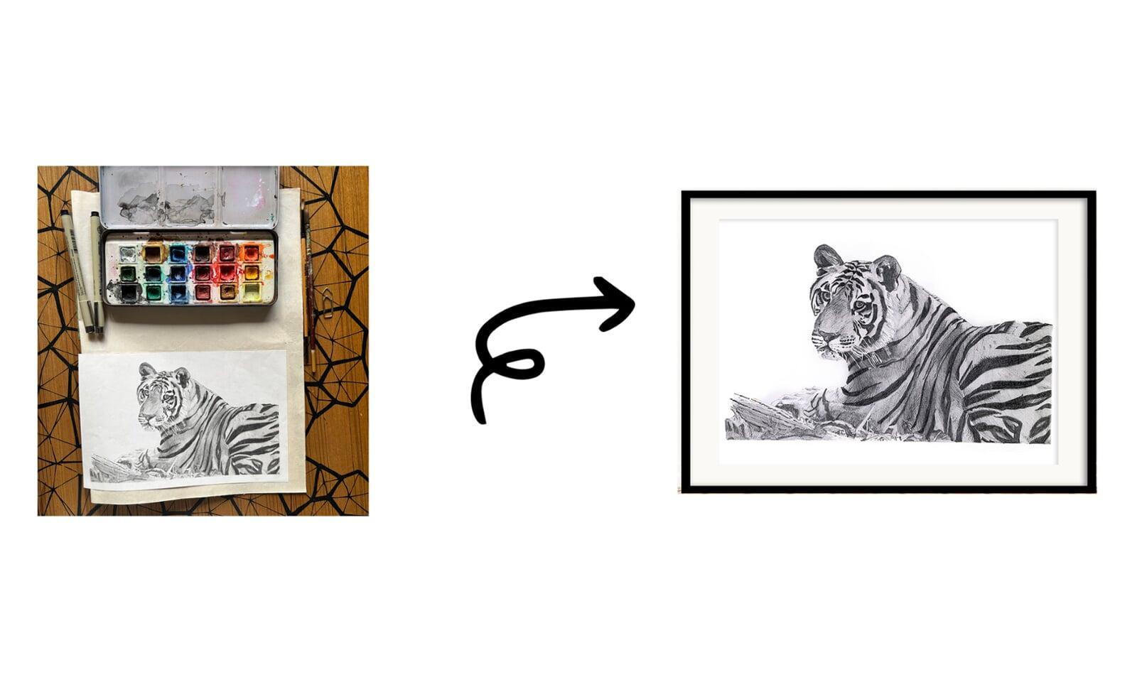 The painting depicts a majestic tiger, intricately detailed with pencil to capture the tiger's features and the calm expression in its eyes. The composition emphasises the tiger's solitary presence, symbolizing the idea of the unique strength that comes from being alone.