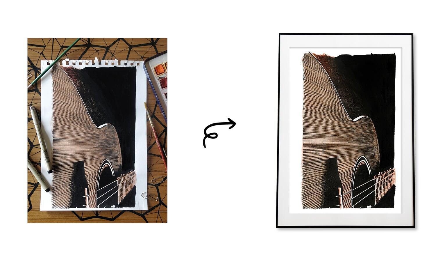 The painting of pen art and watercolour, depicts the essence of the joy derived from playing the guitar. The composition features a detailed depiction of a music guitar, with intricate pen work highlighting the instrument's form and structure. The watercolour elements add vibrancy to the artwork, infusing it with a spectrum of warm, inviting colours that resonate with the emotional and expressive nature of music. The use of subtle gradients and washes contributes to the overall harmonious atmosphere of the piece.