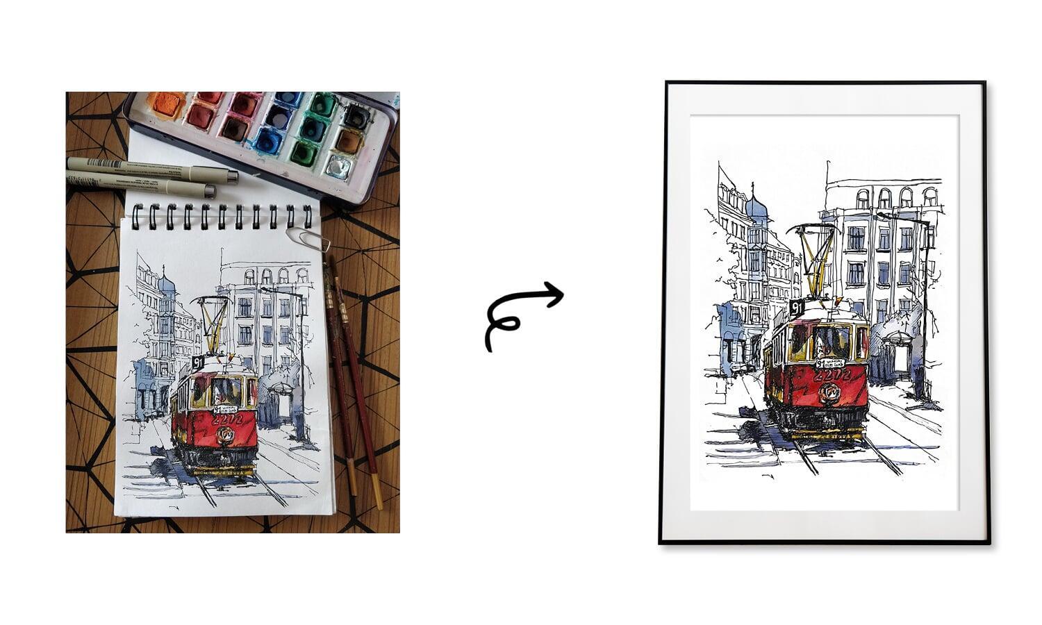 The painting depicts a vintage or classic tram, captured with intricate pen work and painted with soft and nostalgic watercolours. The tram, with its old-world charm, serves as a symbol of transportation and a sense of journey. The pen work highlights the tram's detailed architecture and any unique features that make it distinctive.