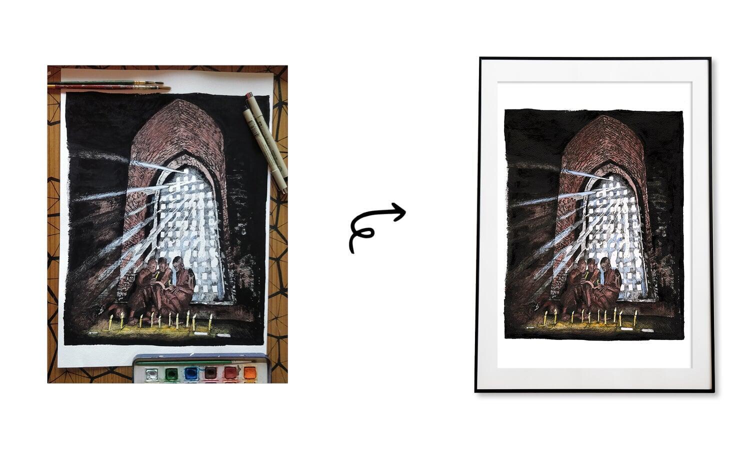 The painting of pen art and watercolour, three young monks are depicted in a serene setting, surrounded by the tranquility of their monastery. The intricate lines of the pen art capture the essence of the monks' peaceful demeanour, while the soft washes of watercolour bring warmth and depth to the scene.