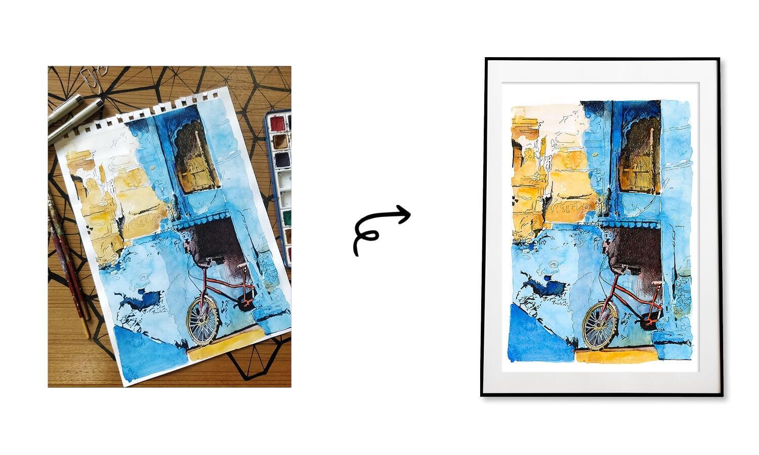The saying "Within the depths of blue, tales of resistance and beauty of simplicity" incorporated into the painting, serves as a contemplative and thought-provoking message. It implies that within the blue city's exterior lies a narrative of strength, resilience, and the enchanting elegance of everyday life. The combination of the blue city and the message reinforces the idea of finding hidden stories and enduring beauty in simplicity. The blend of detailed pen work and the deep, evocative qualities of watercolours creates a visually striking and conceptually evocative artwork. It inspires viewers to reflect on the unique character of the blue city and the stories of resilience that lie within its walls.
