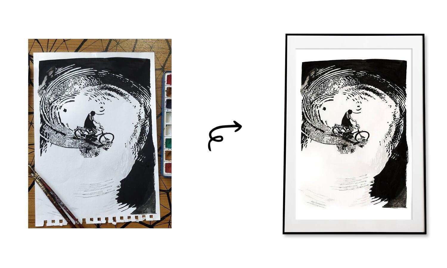 The painting depicts a cyclist in motion, intricately detailed with pen work to capture the movement, energy, and the sense of freedom associated with cycling. The composition emphasises the cyclist in circular motion in water puddles , symbolizing the idea that cycling brings moments of unexpected joy.