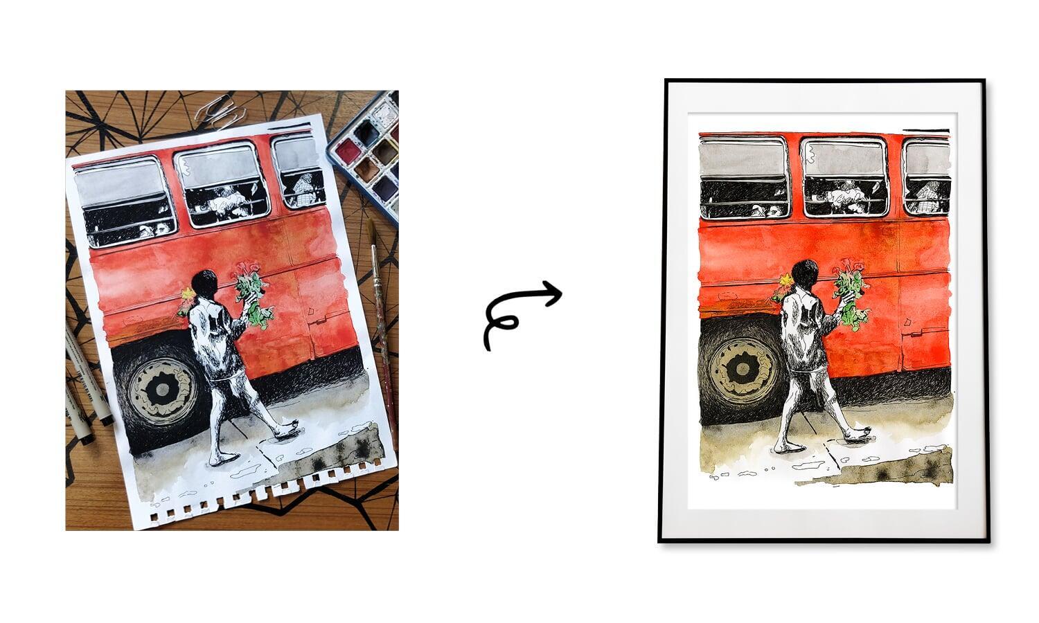 The painting depicts a flower vendor selling roses with a bus in the background on the streets of Mumbai, intricately detailed with pen work to capture the city's scene. Watercolours are used to evoke a lively and vibrant background, creating a sense of movement and the vibrancy of Mumbai's social and professional life. The composition emphasises the city scene, the flow of people, and the blend of daily life and professional activities.