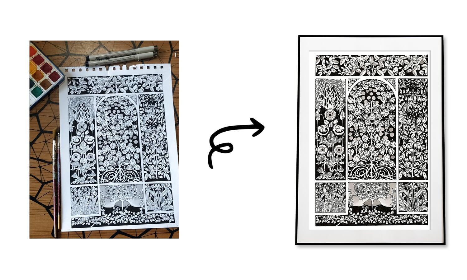 The painting depict flowers, leaves and plants pattern design, with intricate pen work to capture the various elements of the garden. The choice of black and white create a stark contrast that emphasises the shapes, patterns, and textures in the garden. The composition emphasises the intricate details of the garden, from the plants and flowers to the pathways and structures.