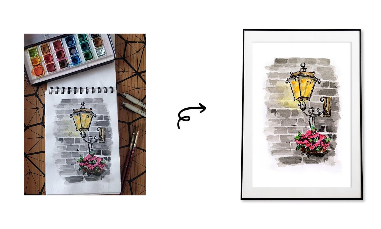 The lamp set in an environment that complements its colour and radiance. The watercolours create a lively and joyful backdrop, with warm, inviting tones that evoke a sense of happiness and light. The saying "Radiate joy from the inside out" incorporated into the painting, adding an inspirational and motivational message. It encourages viewers to find inner happiness and share it with the world, spreading positivity and warmth to those around them. The combination of the yellow lamp and the message reinforces the idea of inner radiance. The combination of detailed pen work and the vibrant, expressive qualities of watercolours create a visually captivating and emotionally resonant artwork. It inspires viewers to embrace joy and share it with others, reminding them that happiness starts from within and has the power to brighten the world.