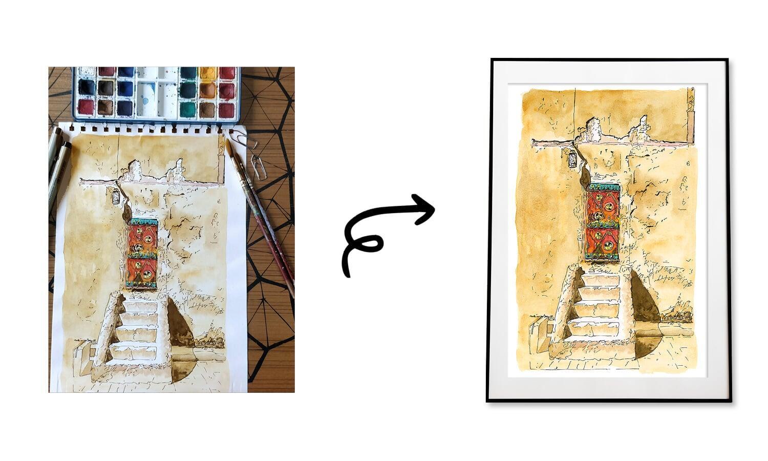 The saying "Rural doors are like faces of villages, each one unique and full of character" incorporated into the painting, serves as an insightful and contemplative message. It implies that the doors in rural areas are not just functional entryways but are symbolic of the distinctiveness and character of the villages they belong to. The combination of the rural door and the message reinforces the idea of embracing the uniqueness and diversity found in rural communities. The blend of detailed pen work and the evocative qualities of watercolours creates a visually diverse and conceptually insightful artwork. It inspires viewers to appreciate the cultural richness and individuality of rural villages, as represented by their distinctive doors.