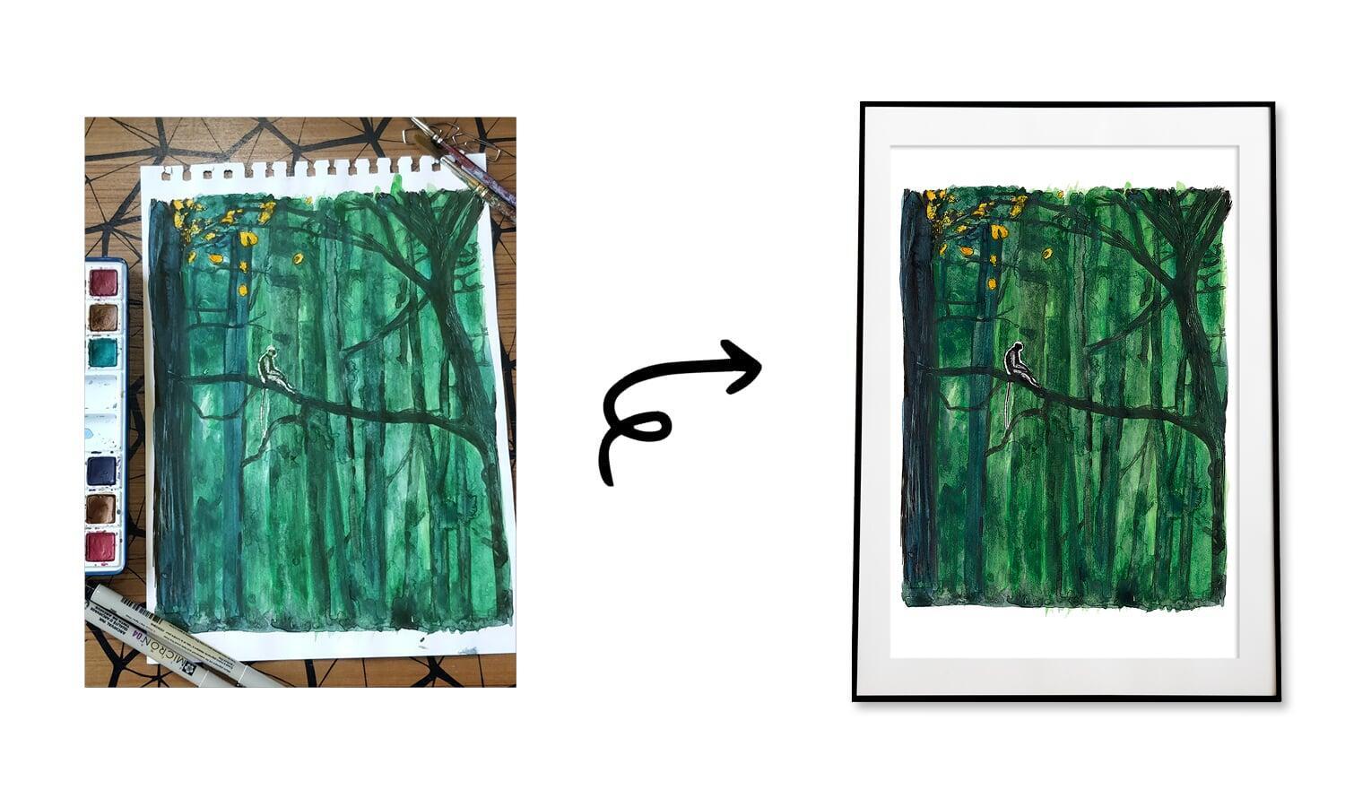 The painting depicts a serene forest scene with a monkey resting on a tree branch, intricately detailed with pen work to capture the natural beauty of the setting. Watercolours are used to create a calming and harmonious background, evoking the sense of stillness and peace in the forest. The composition emphasises the monkey on the tree branch as the central element, with the surrounding forest serves as a backdrop that enhances the feeling of tranquility.