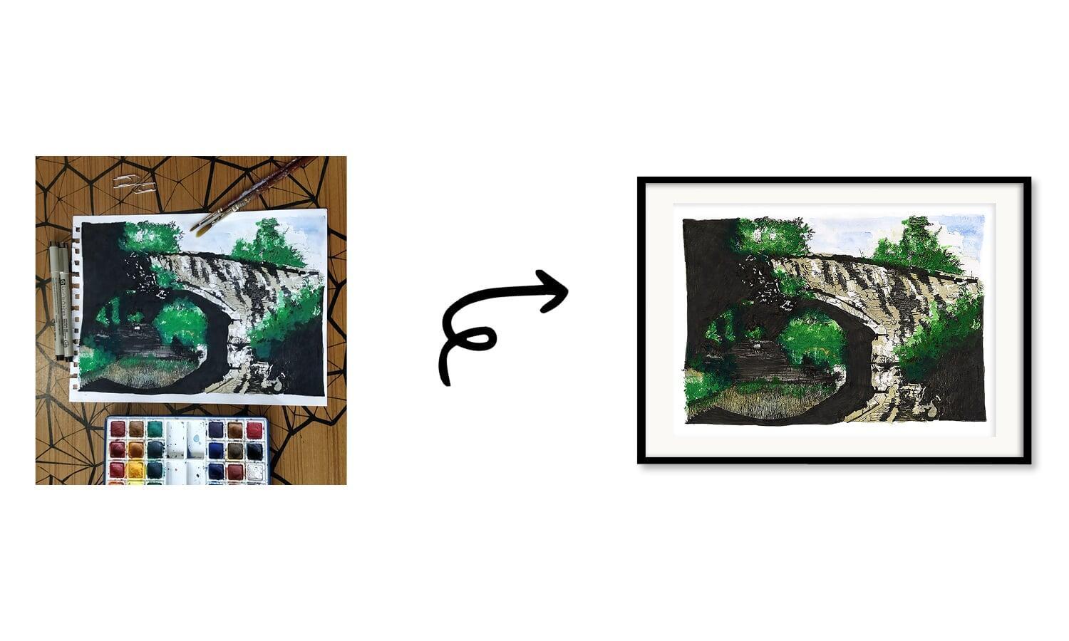 The painting depicts a beautiful bridge in a peaceful, natural setting, intricately detailed with pen work to capture its architectural elegance. Watercolours are used to create a scenic atmosphere, symbolizing the journey from dreams to reality. The composition emphasises the bridge as a central element setting the mood for the scene.