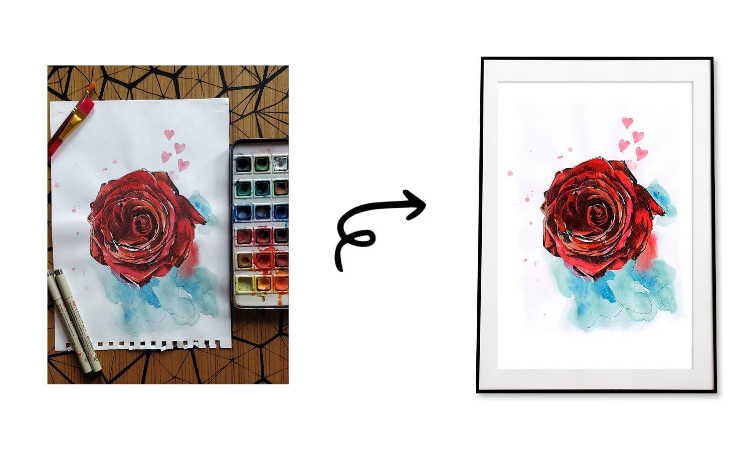 The saying "Love is a rose, each petal is a heartbeat of passion" incorporated into the painting, serves as a romantic and contemplative message. It implies that love is a beautiful and passionate journey, with each petal of the rose symbolizing the heartbeats of affection and desire. The combination of the rose and the message reinforces the idea of love as a passionate and captivating experience. The blend of detailed pen work and the romantic, passionate qualities of watercolours creates a visually captivating and conceptually evocative artwork. It inspires viewers to see love as a vibrant and passionate rose, with each moment of affection and desire being a petal that makes up the whole.