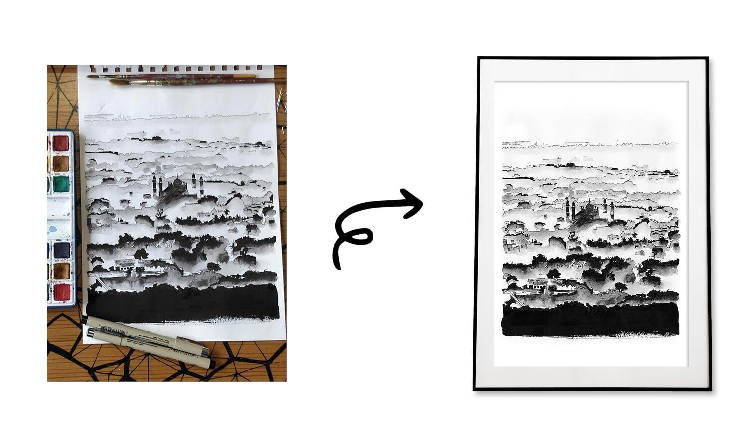The painting depicts the silhouette of the iconic Taj Mahal, in pen work to capture its architectural grandeur. The composition emphasises the Taj Mahal as the central element, midst the city’s atmosphere enhancing the sense of wonder and enchantment.