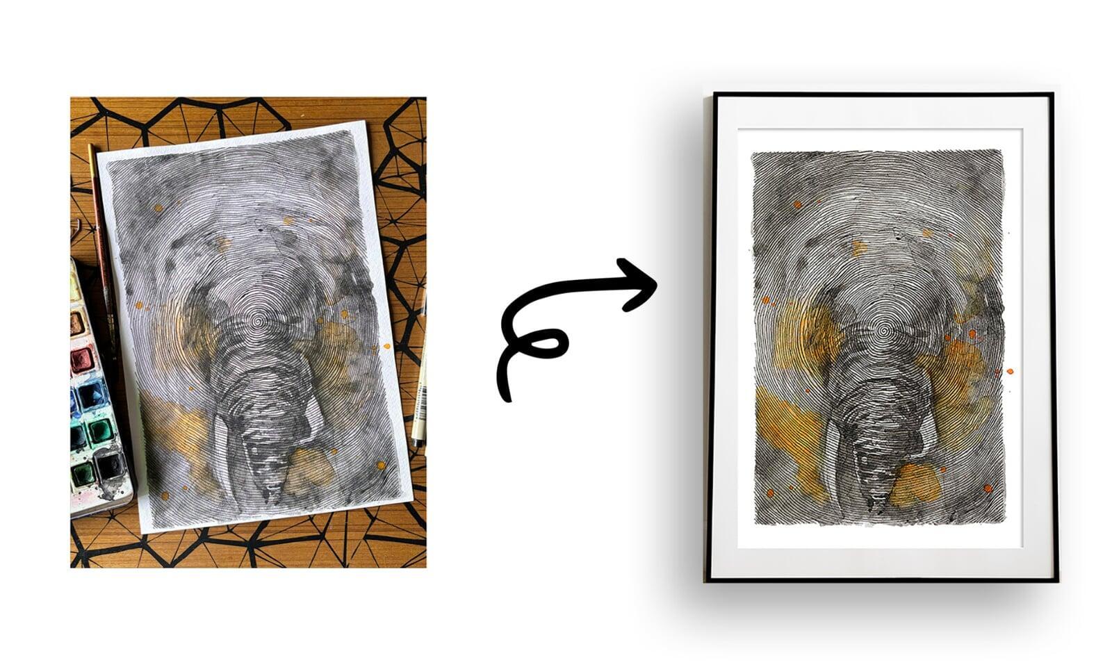 The painting depicts an elephant as a depiction of Lord Ganesha, intricately detailed with pen work to capture its features and intricate symbolism. Watercolours are used to create a spiritual and transcendent ambiance, symbolizing the infinite and boundless nature of consciousness. The composition emphasises Lord Ganesha in spiral lines as the central element, with the watercolour background enhancing the overall sense of spirituality and profound consciousness.
