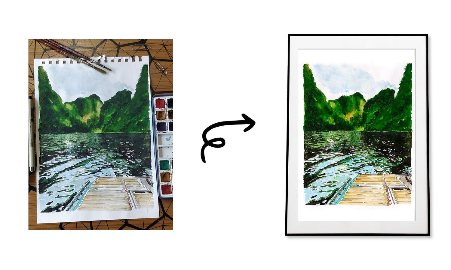 The painting depicts the breathtaking beauty of Ha Long Bay, with its iconic limestone karsts and emerald waters, intricately detailed with pen work to capture the natural wonder. Watercolours are used to evoke the magical and mysterious qualities of the bay's waters. The composition emphasises the striking landscape of Ha Long Bay as the central element, with the watercolour background enhancing the overall sense of enchantment and magic.
