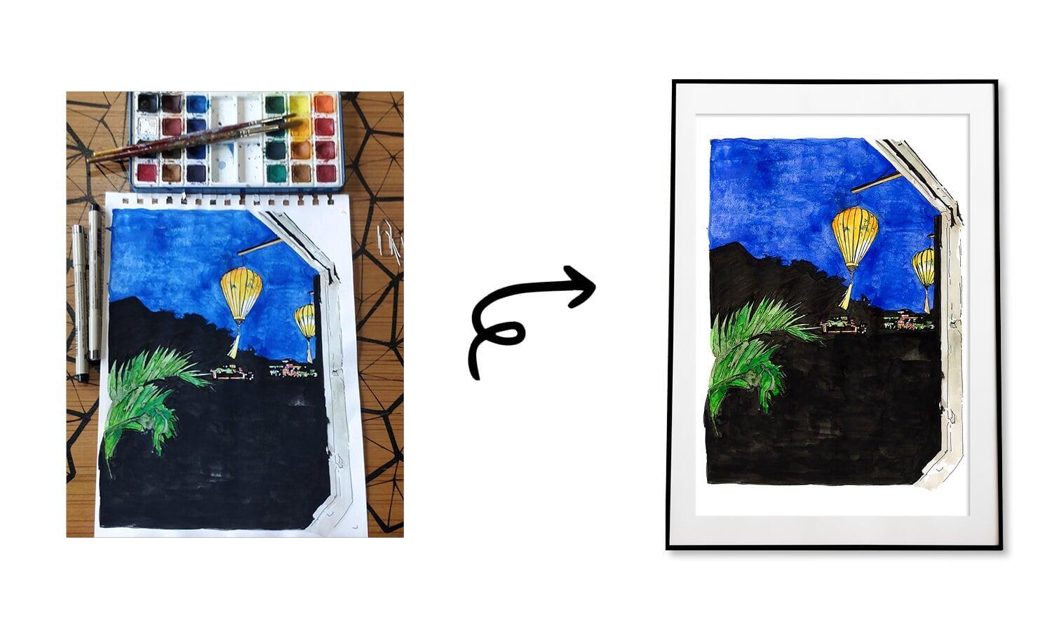 The painting depicts beautifully crafted lanterns, intricately detailed with pen work to capture their intricate designs and vibrant colours. Watercolours are used to create a warm and inviting ambiance, symbolizing the inner glow and peace that lanterns often represent. The composition emphasises a lantern as the central element, with the watercolour background enhancing the overall sense of tranquility and harmony.
