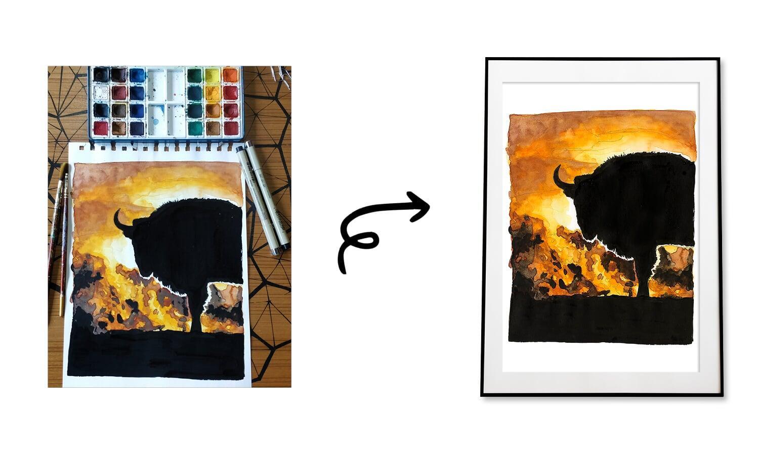 The painting depicts a powerful and majestic bull, in pen work to capture the strength and grace of the animal. Watercolours are used to create a contemplative and introspective ambiance, symbolizing the inner strength that resides within each of us. The composition emphasises the bull as the central element, with the watercolour background enhancing the overall sense of quiet power and inner strength.