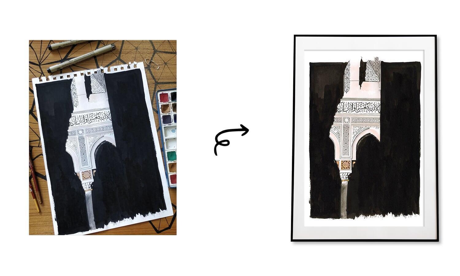 The painting depicts part of beautiful mosque with intricate pen work capturing the architectural details, while watercolours are used to evoke a sense of peace and spirituality in the scene. The composition emphasises part of the mosque as the central element, with the watercolour elements creating a harmonious and tranquil atmosphere.
