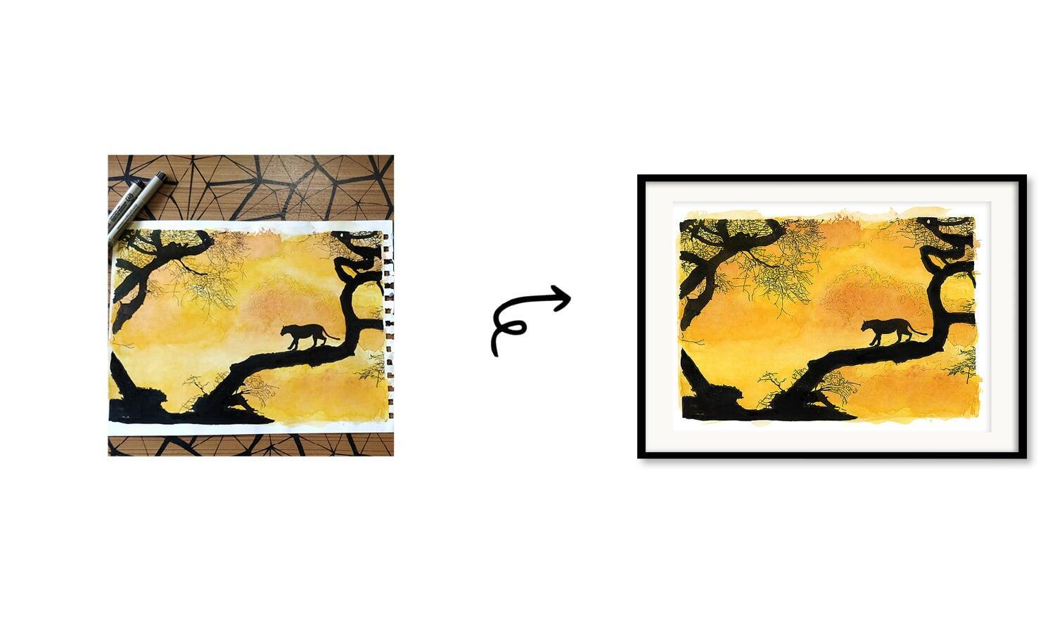 The painting depicts a sleek and powerful panther in pen work, while watercolours are used to enhance the intensity and uniqueness of the background. The composition might emphasise the panther as the central element, with watercolour elements creating a dynamic and vibrant background.