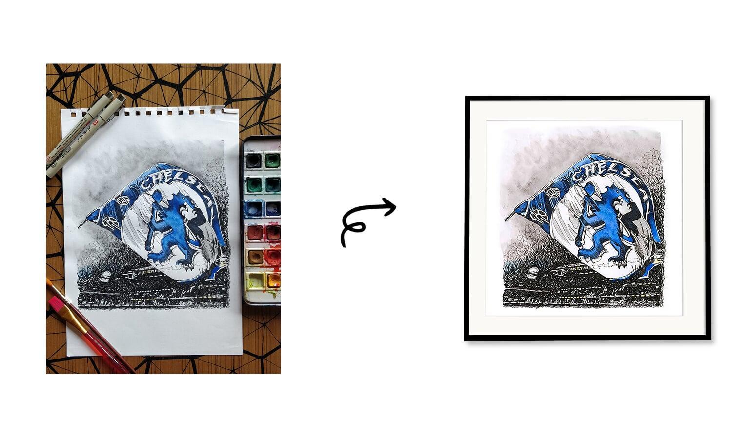 The painting depicts a Chelsea team flag, the team logo, the iconic symbols associated with Chelsea. Pen work captures the details of the flag, while watercolours bring vibrancy to the composition.