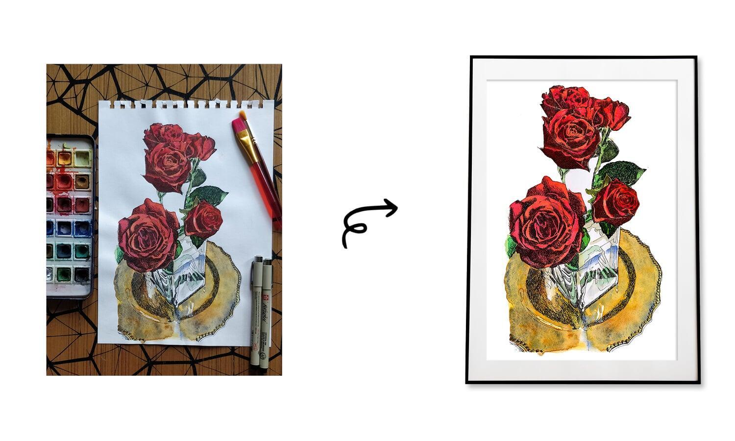 The painting depicts a bouquet of roses, intricately drawn with pen work to capture the details of each petal and watercolours used to convey the soft, romantic hues of the flowers. The composition emphasises the beauty and elegance of the roses, with watercolour elements creating a gentle and soothing atmosphere.