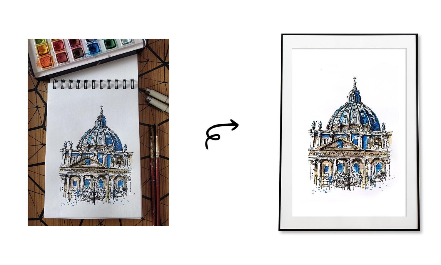 The painting features the majestic St. Peter's Basilica, depicted with intricate pen work to capture the intricate architectural details of the building, including its stunning dome and the grandeur of the exterior. The watercolours used to highlight the subtle shades and textures of the basilica's facade and the play of light and shadow.