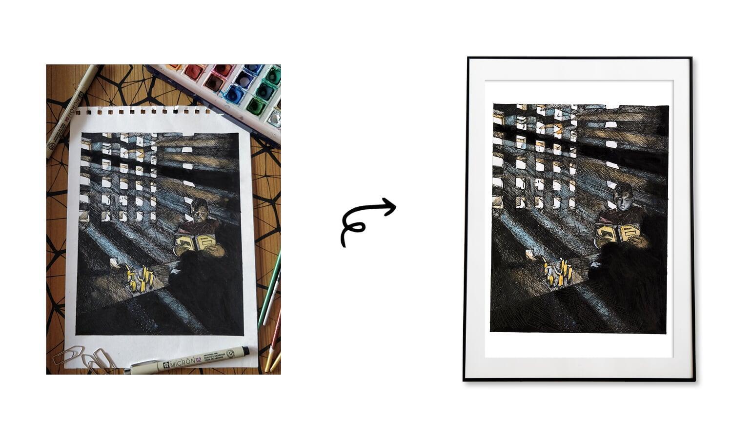 The painting depicts a serene monk reading a book, with pen work capturing the details of the peaceful expression on their face and play of light and shadow . Watercolours are used to convey the ethereal and connected nature of the scene, perhaps incorporating elements of nature or a sense of spiritual tranquility.