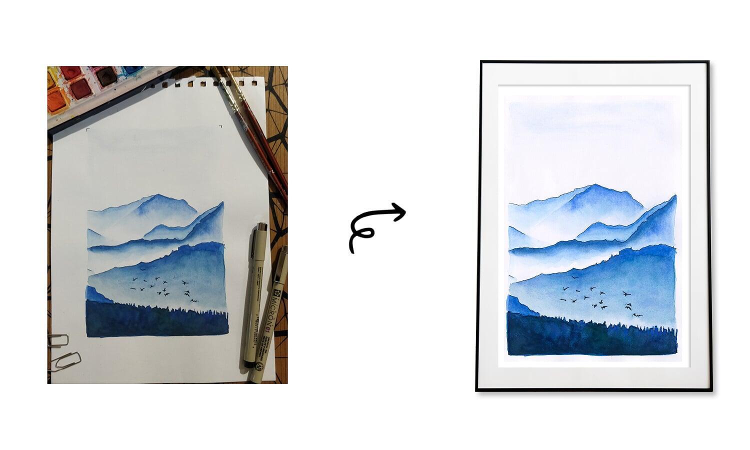 The painting showcases mountain ranges, outlined with pen work to capture the landscape. Watercolours are used to evoke the natural colours and the play of light and shadow, creating a sense of grandeur and majesty.