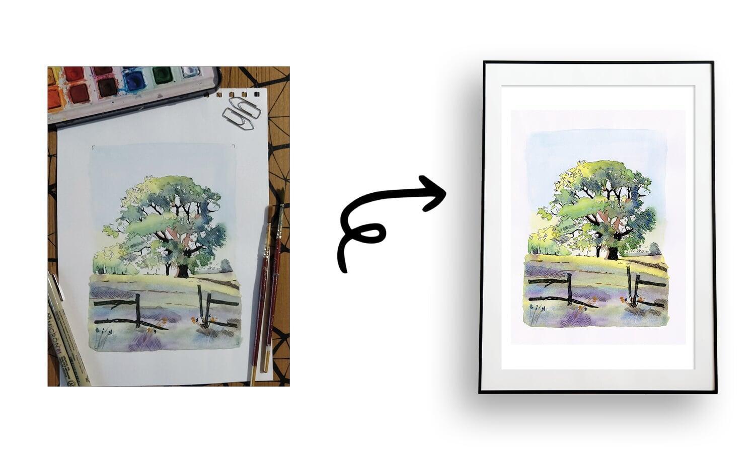 The painting depicts a strong and majestic tree, intricately detailed with pen work to capture its branches, leaves, and the ruggedness of its bark. Watercolours are used to evoke the natural colours and the sense of life and vitality within the tree.