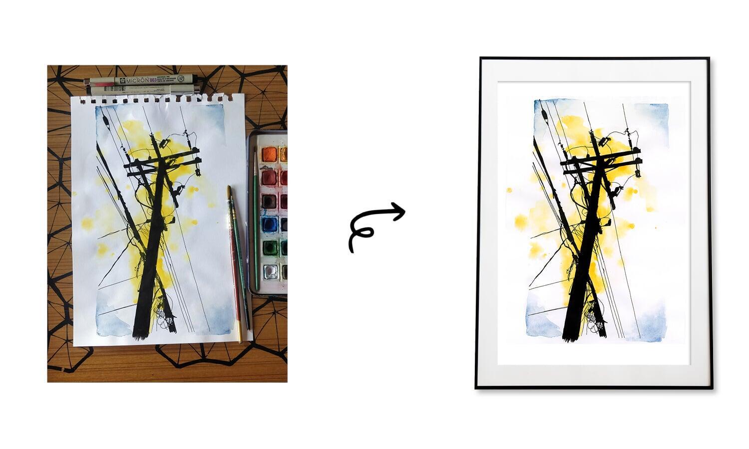 The painting depicts a stylized electric pole, with intricate pen work capturing the design and details of the pole. Watercolours are used to convey the warm and radiant glow of the light, creating a sense of illumination and vitality.