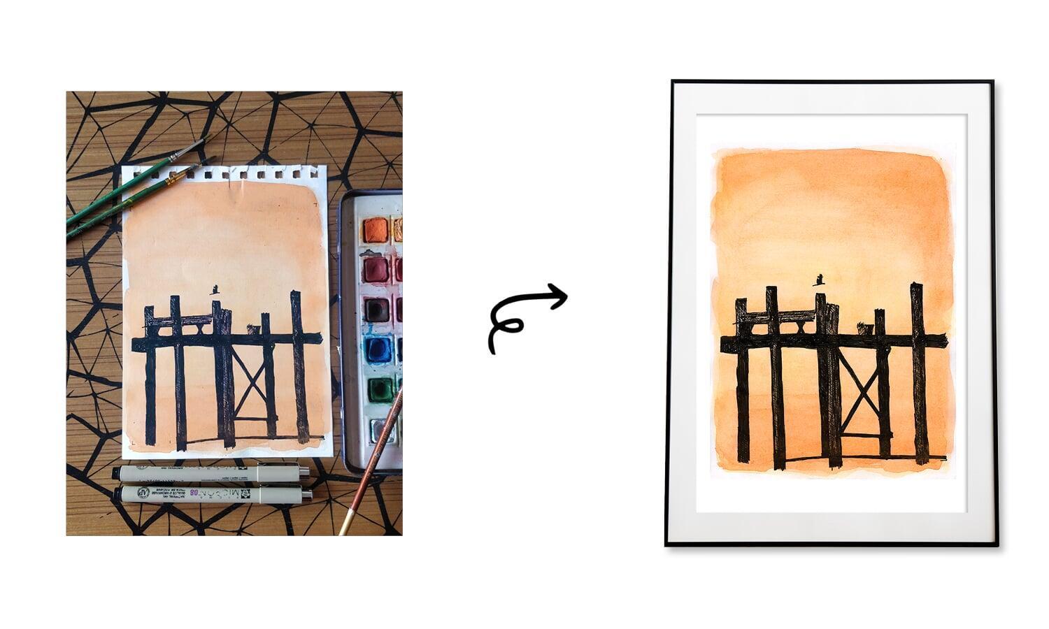 The saying "Bridges may weather storms, but the best strength lies in the unity of each plank" is incorporated into the painting, serves as a metaphorical and thought-provoking message. It implies that bridges, like the U Bein Bridge, may endure challenges and difficulties, but their true strength comes from the unity and connection of each individual component, just like the planks of a bridge. The combination of the U Bein Bridge and the message reinforces the idea of unity and the resilience that can be achieved when people come together. The blend of detailed pen work and the soft, evocative qualities of watercolours creates a visually captivating and symbolically rich artwork. It inspires viewers to reflect on the strength of unity and the importance of coming together to face challenges.