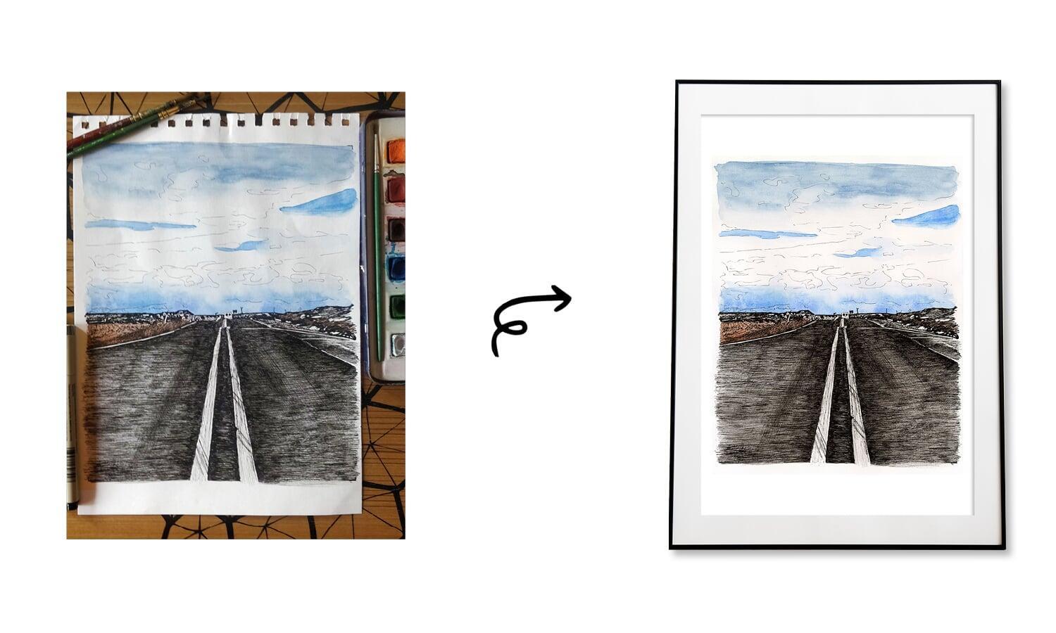 The painting depicts a straight road that symbolizes the journey of a traveler, intricately detailed with pen work to capture the elements of the road and the surrounding landscape. Watercolours are used to evoke the colours of the natural environment and the sense of adventure and discovery.
