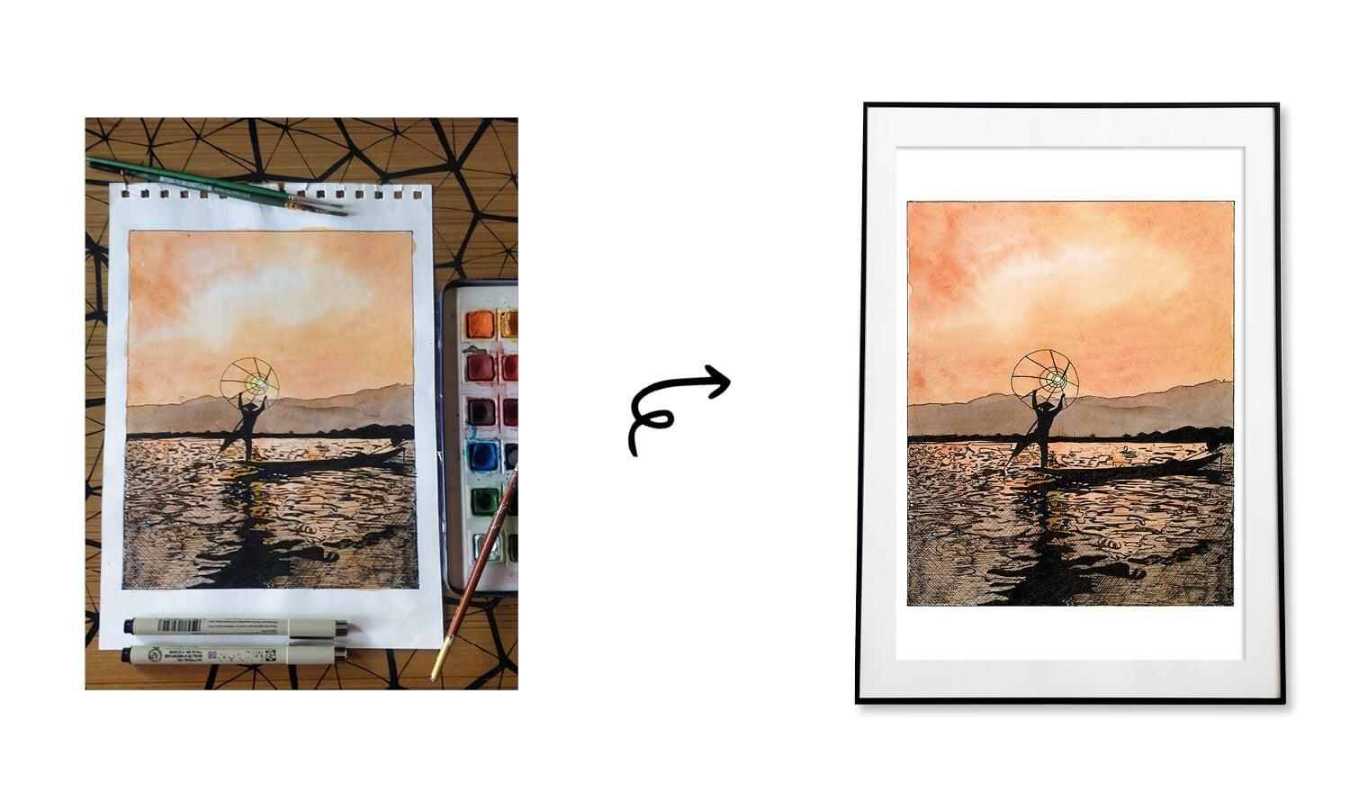 The painting depicts the serene and tranquil waters of Inle Lake with a traditional Intha fisherman, intricately detailed with pen work to capture the boat, the fisherman's pose, and the unique fishing technique. Watercolours are used to evoke the soothing and harmonious colours of the lake and the surrounding landscape, creating a sense of peacefulness and reflection.