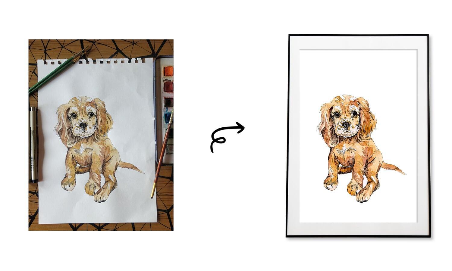 The painting depicts a loveable pup, intricately detailed with pen work to capture the dog's expressive eyes, wagging tail, and affectionate demeanour. Watercolours are used to represent its colour and fur to evoke the warm and compassionate bond with the pup, creating a sense of emotional connection.