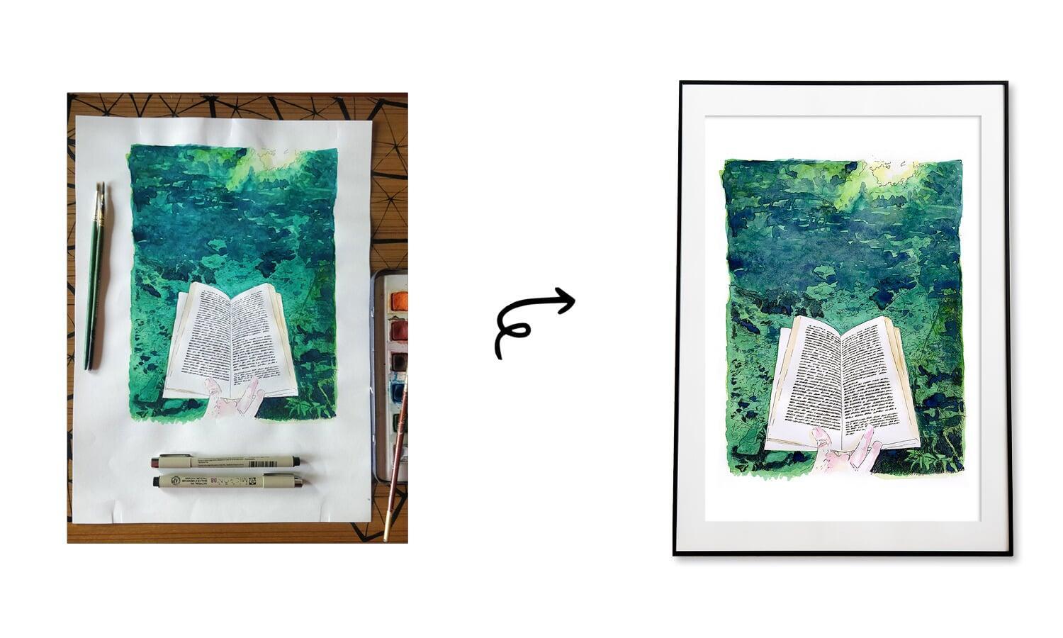 The painting depicts a book in hand, intricately detailed with pen work. Watercolours are used to create an atmosphere of the physical place, as well as to evoke the sense of being transported to different places and times through reading. The composition emphasises the person's quiet and contemplative moment, symbolizing the mental journey that books offer.