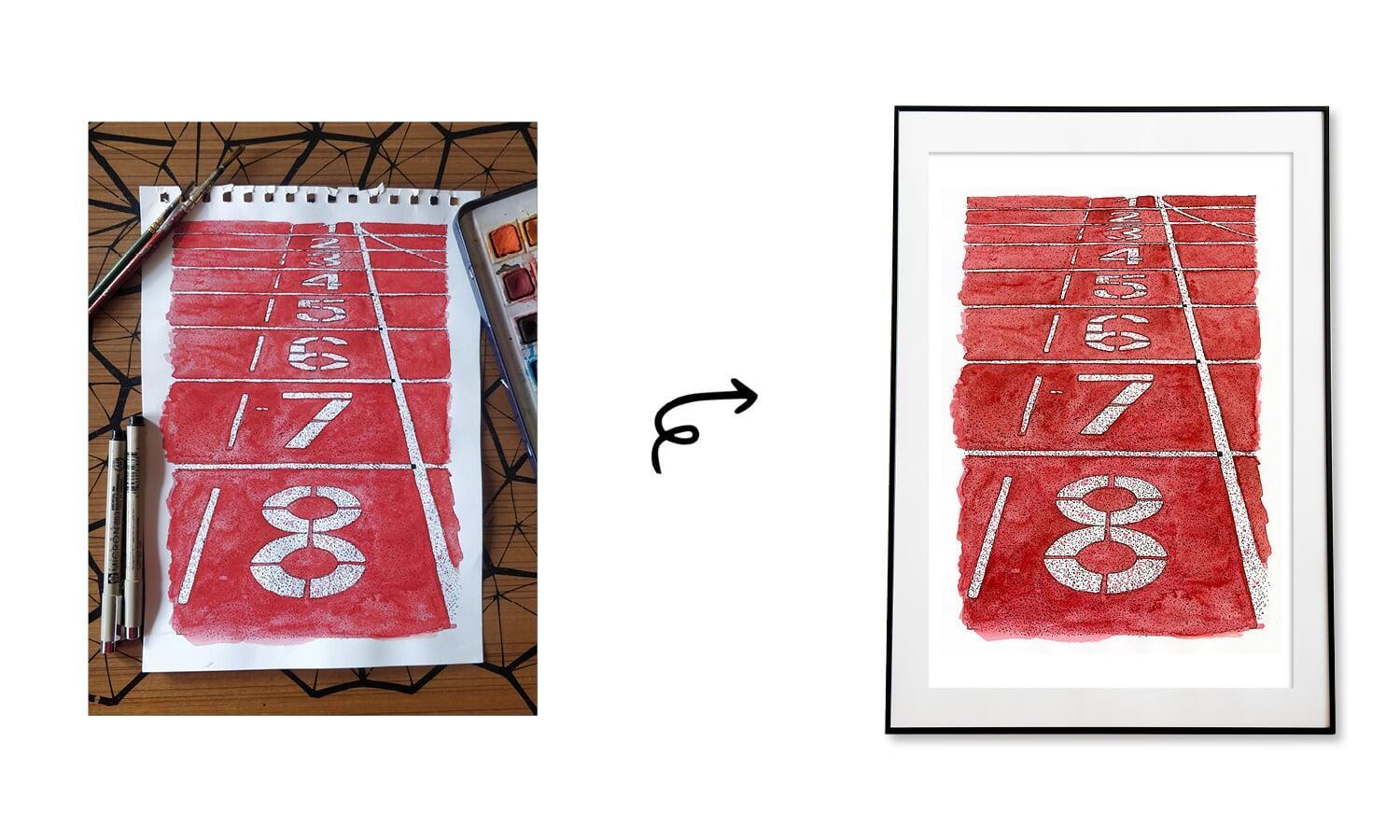 The painting depict a running track numbers, intricately detailed with pen work to capture the texture of the ground. Watercolours are used to give the natural colour, use and wearing out of the track. The composition emphasises the idea of a journey, with the numbers rising and disappearing into the distance, symbolizing the ongoing nature of life's adventures.