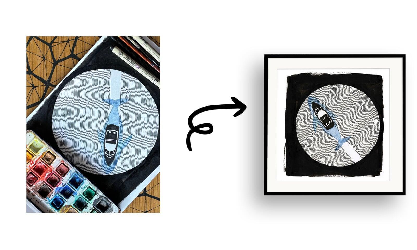 A boat rides the waves formed by hypnotic pen lines, unaware (or unafraid) of the shark swimming beneath. This speaks to coexistence with fear, beauty, and the unknown. Lesson from nature: Respect every presence, seen or unseen.