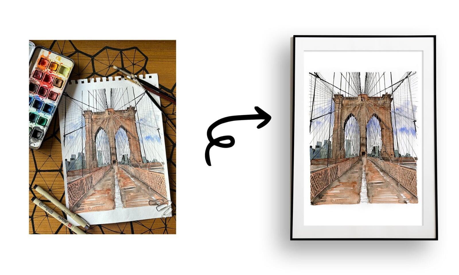 This pen and watercolour painting captures the grandeur and symbolism of the Brooklyn Bridge — a feat of architectural brilliance and human collaboration. The viewer is placed directly on the path, walking toward the stone arches, flanked by delicate lines of suspension cables that radiate outward like threads of connection. The rich rust tones of the bridge and soft blues of the sky create a powerful contrast — one of grounded strength and open possibility. The bridge itself becomes a visual metaphor: a link between not just places, but people, ideas, and efforts.
