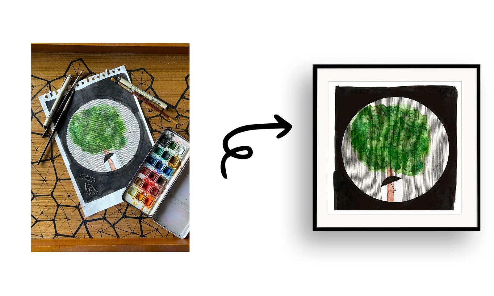 A lush green tree stands tall against vertical black lines resembling rain. An umbrella below—a small moment of shelter, comfort, and mutual reliance. Lesson from nature: Protection and compassion thrive when rooted in strength.