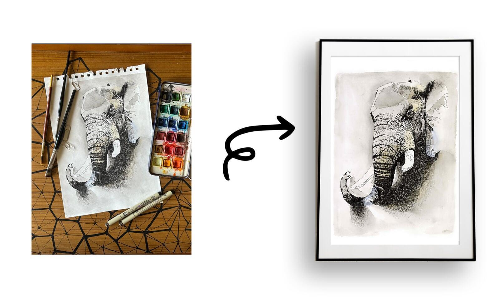 This evocative pen and watercolour painting captures the quiet majesty of an elephant—its wrinkled wisdom, gentle strength, and timeless presence. Rendered in soft earth tones with delicate ink textures, the elephant appears to emerge from a haze of memory or mist, half in shadow and half in light. Its eye, nearly closed, exudes both peace and contemplation, as if it's not just observing the world, but carrying it within.