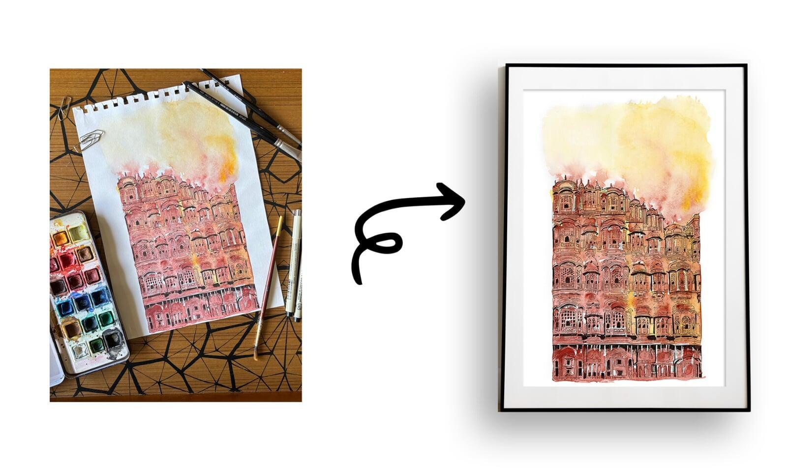 Framing it in a muted gold or teakwood frame with a soft cream mat can elevate the traditional aesthetic, while hanging it with soft lighting will highlight the detailed linework and the warm hues of the watercolour sky. Together, the image and quote invite viewers to not only admire beauty—but to peer deeper into the layered stories of the past.