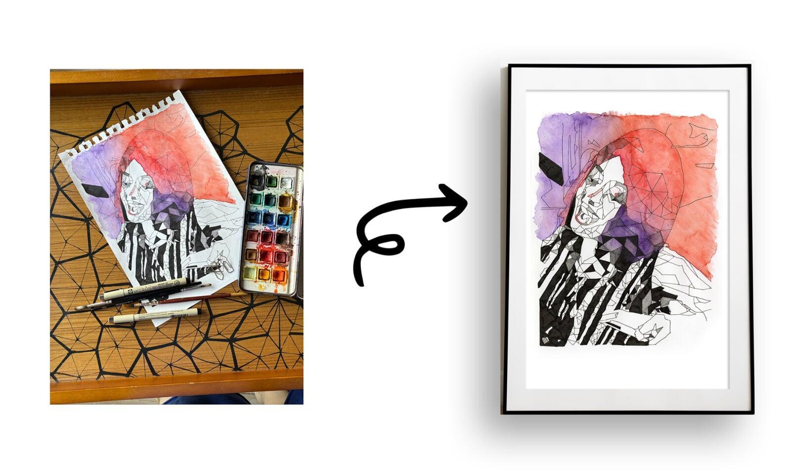 This artwork is a compelling fusion of pen art and watercolour, blending geometric abstraction with fluid, emotive colour. The piece uses sharp, fragmented lines—almost like a stained glass mosaic—to construct the subject’s face and figure, creating a dynamic interplay between structure and spontaneity. The detailed pen work features heavy black areas and cross-hatching, giving it a dramatic and textured appearance. The watercolour backdrop, a gradient that transitions from deep violet to warm red, adds emotional depth and vibrancy. This contrast of cool and warm hues evokes a sense of duality—perhaps joy and melancholy, or calmness and passion.