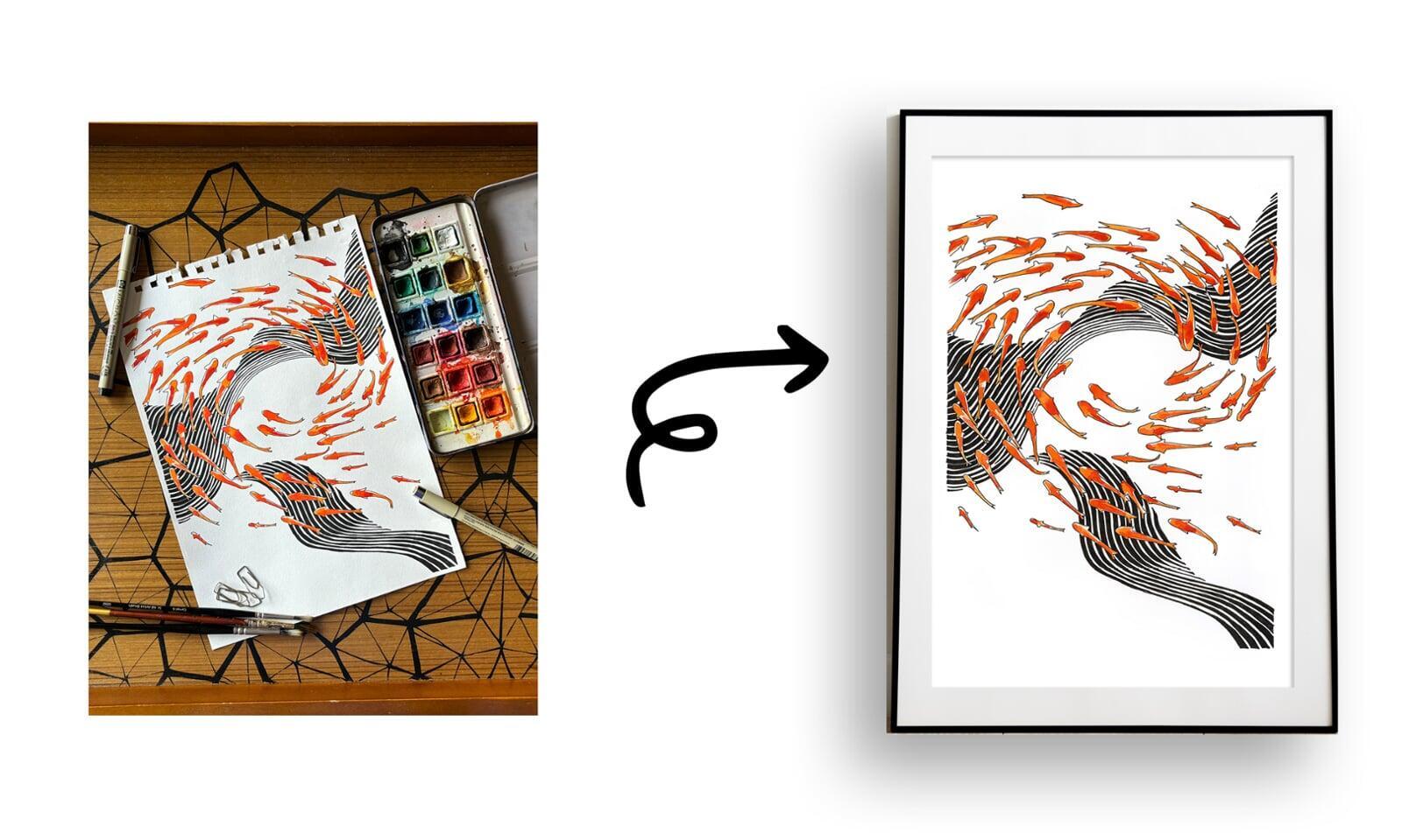 This striking pen and watercolour piece is a dynamic dance between movement and stillness, chaos and calm. Bright orange fish flow in rhythmic harmony across sweeping black ink waves, creating a visual tide of motion that feels both purposeful and playful. The minimalist white background emphasizes their vibrant energy, allowing the composition to breathe and ripple like water in motion.