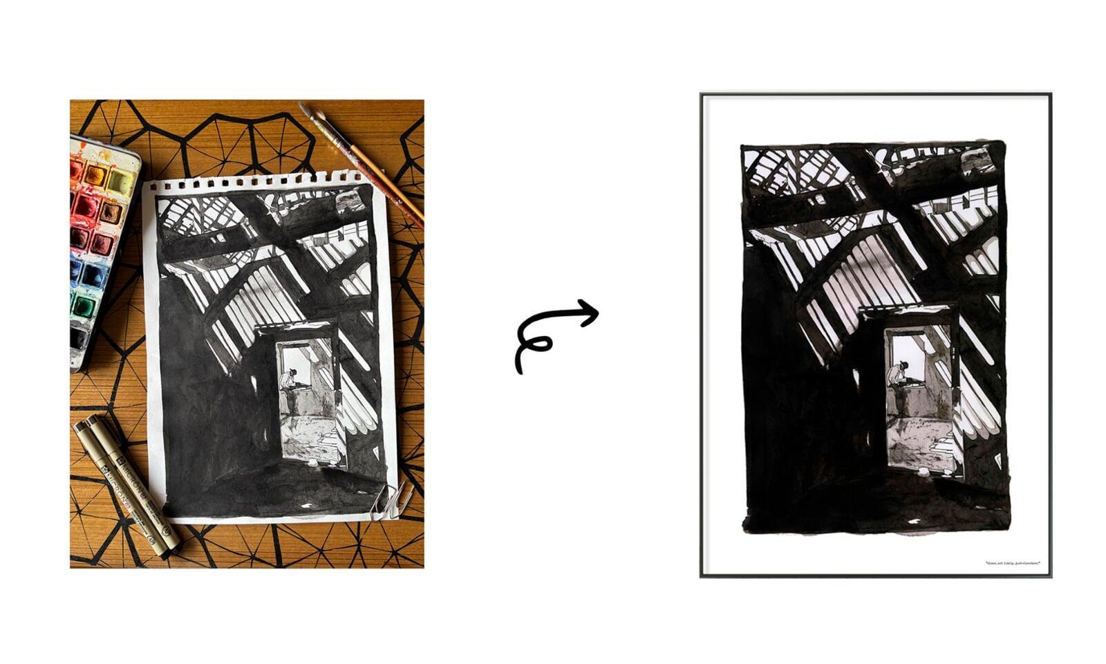 This pen and watercolour painting creates an atmosphere that is both intimate and expansive, a play of deep shadows and luminous light. Set within a darkened, almost cavernous interior—possibly an old warehouse, attic, or industrial ruin—the eye is drawn to a doorway where a lone figure bends quietly over a table, illuminated by daylight streaming through slatted openings above.