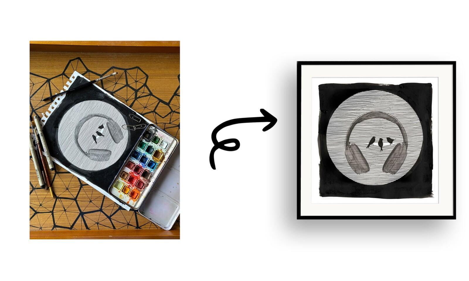 Three birds perch on the wire of a pair of headphones, replaced by a human-made object into the music world. It symbolizes replacement of rhythm in nature and modern life. Lesson from nature: Find harmony, even in contrast.