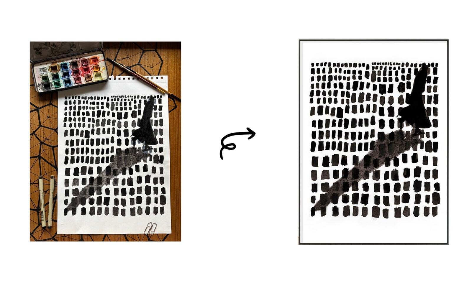 This pen and watercolour painting is a powerful visual metaphor for defiance, self-direction, and quiet revolution. A dark figure strides confidently through a field of uniformly placed, abstract black marks—each resembling bricks, pixels, or typed characters—cutting diagonally across the grid in stark contrast to the system around them.