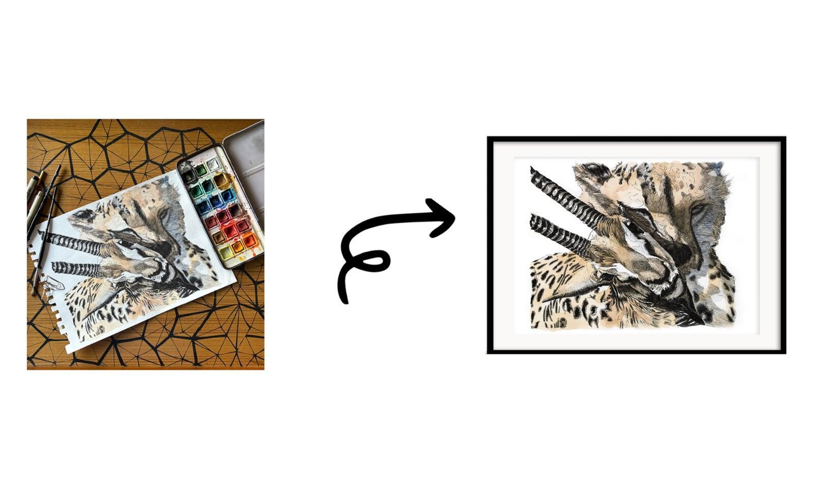 This intense pen and watercolour composition captures a moment of raw reality — a confrontation between a cheetah and a gazelle, portrayed with emotional complexity rather than just physical drama. The close intertwining of their faces suggests not only the inevitable roles of nature but also the psychological interplay between fear and dominance. Rendered with exquisite detailing in ink and warm earthy hues, the painting strips away distraction and presents the essence of instinct, vulnerability, and power. The gazelle’s eyes are alert, wide, yet calm, while the cheetah’s stare is deep and haunting. There's tension, yes — but also an unsettling sense of stillness, as though both creatures understand the rules they are bound by.