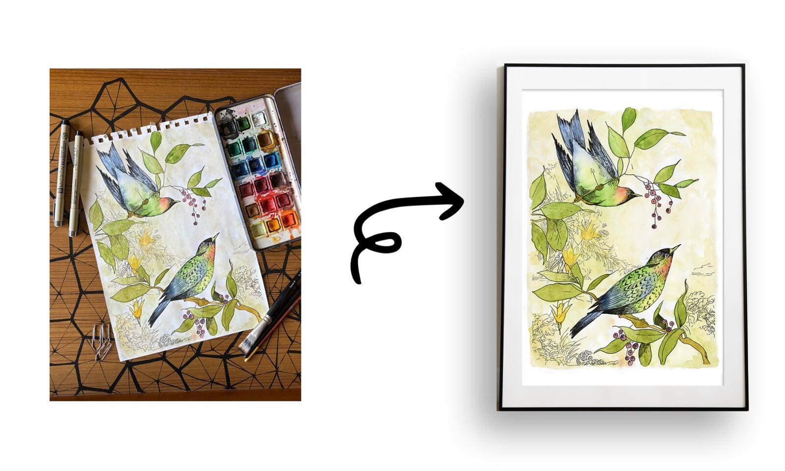 This pen and watercolour painting beautifully captures the delicate elegance of two songbirds amid a tangle of leaves, berries, and blossoms. One bird rests serenely on a branch, while the other is mid-flight, wings gracefully spread — creating a sense of harmony, movement, and stillness all at once. The intricate pen linework outlines each leaf and feather with care, while soft, layered watercolours in hues of blue, green, pink, and yellow give the birds a radiant, almost iridescent life. The background — a gentle wash of golden cream — further enhances the calm and pastoral mood of the scene.