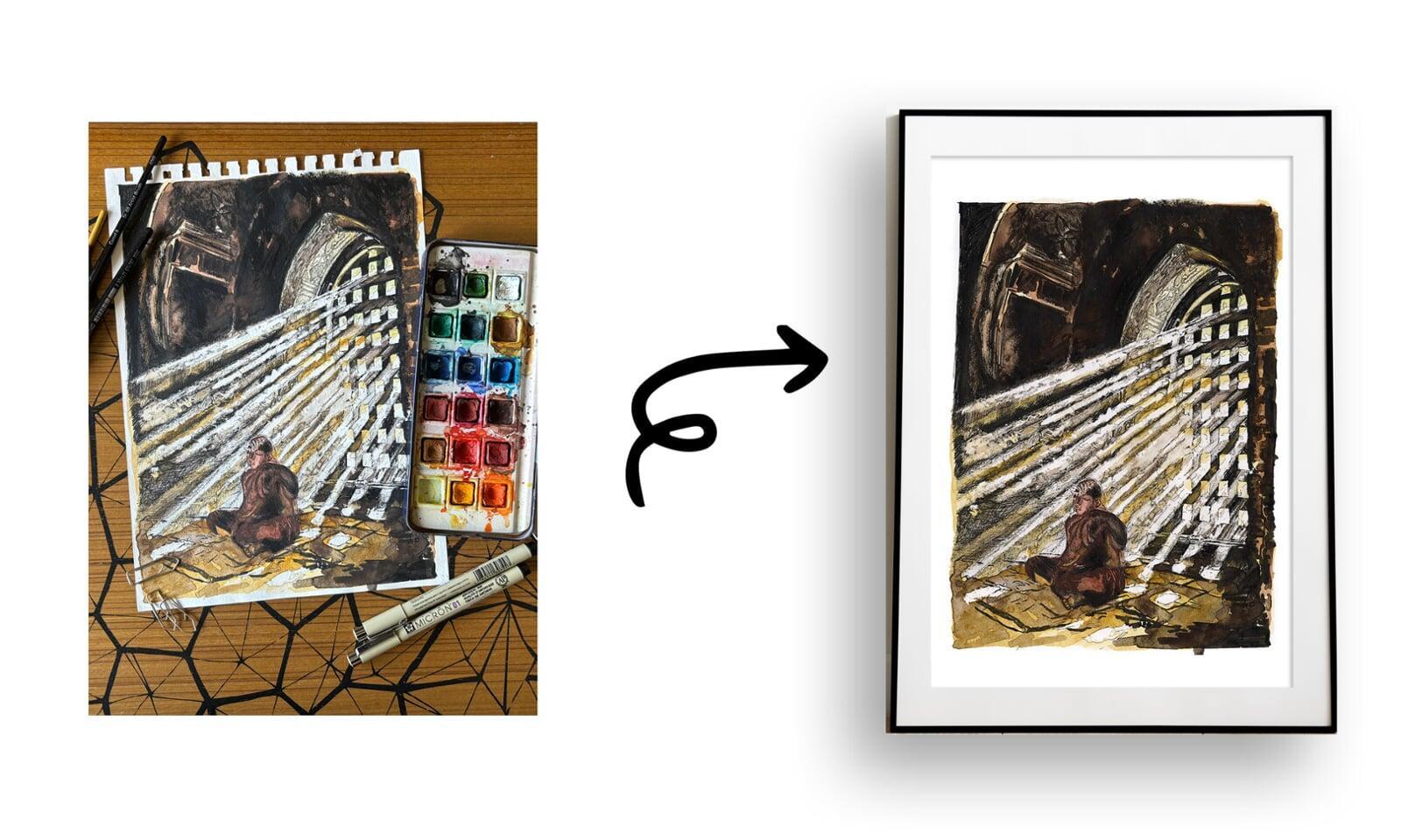 In this stunning pen and watercolour composition, we are drawn into a sacred moment of stillness and illumination. A monk sits cross-legged on a stone floor, cloaked in deep browns and rust-reds, surrounded by the soft geometry of ancient architecture. Light pours in through a lattice gate, forming sharp, celestial beams that slice through the darkness, bathing the figure in a silent shower of illumination. Every stroke, from the textured stonework to the monk’s calm expression, captures a profound meditation on stillness, solitude, and self-realization.