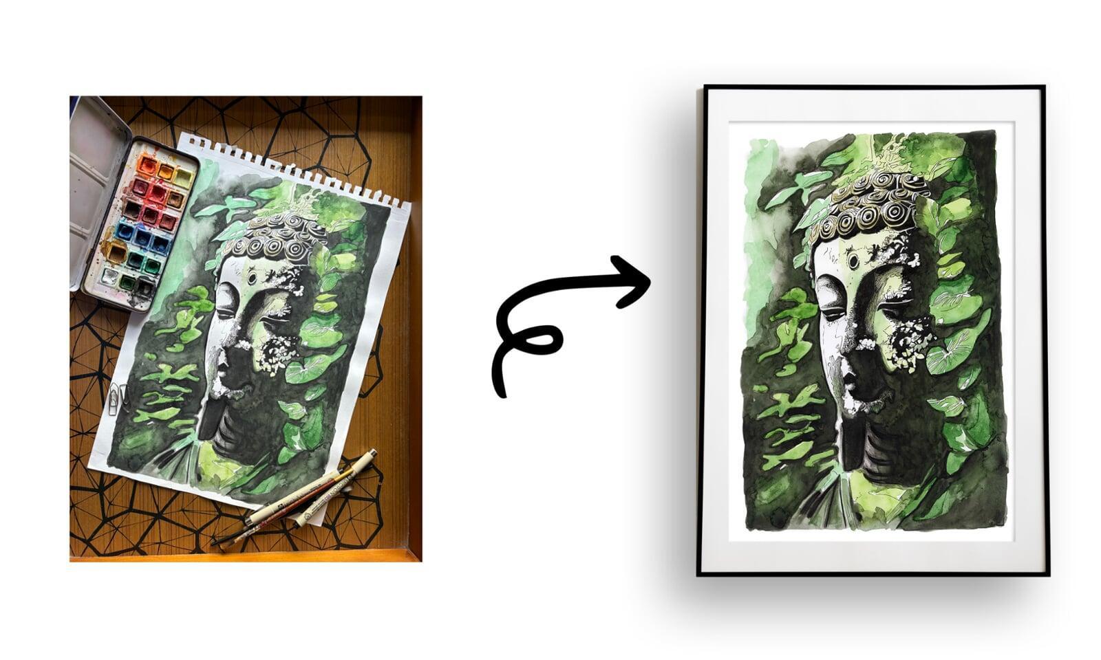 This pen and watercolour artwork portrays a serene Buddha head emerging gently from a sea of lush green foliage — half revealed, half embraced by nature. Time and weather have softened the sculpture’s surface, but not its spirit. The painting’s contrast between delicate linework and rich, fluid greens creates a meditative aura, where silence speaks louder than form. The foliage seems to grow into and out of the Buddha, blurring the boundary between man-made and natural, silence and presence. The eyes, closed in eternal inward gaze, remind the viewer that true awareness doesn’t come from looking outward, but from listening within.