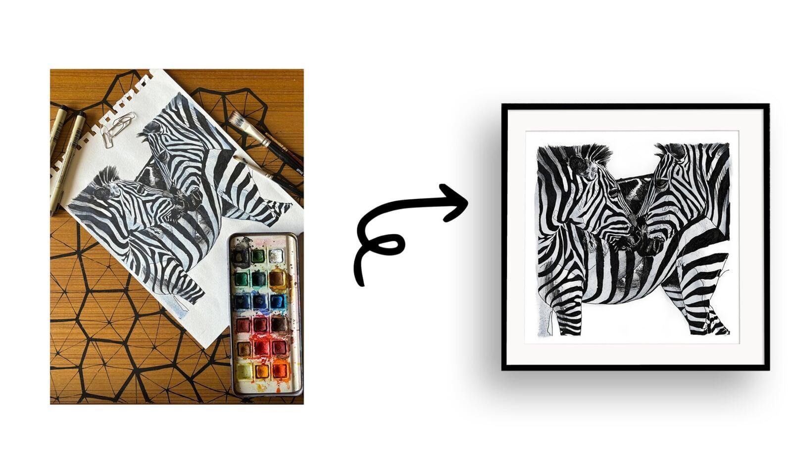 This striking pen and watercolour illustration captures a tender moment between two zebras, their faces gently touching, their black and white stripes mirroring and blending into one another. The interplay of ink and soft wash creates a visual harmony that speaks of unity, reflection, and deep emotional connection. Each line and curve of the zebra’s coat is rendered with care, not only to show the form but also to emphasize the idea of duality and sameness—two beings that are distinct, yet intrinsically connected.